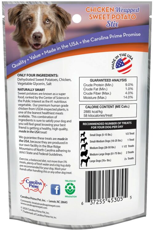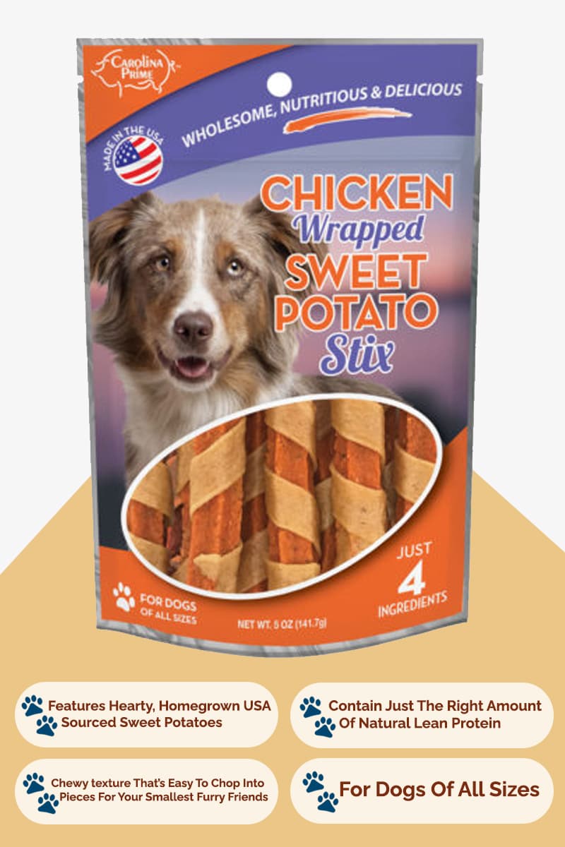 Love the convenience of stick-shaped treats, but wary of questionable meat sources? Put your worries to rest with Chicken Wrapped Sweet ‘Tater Sticks from Carolina Prime. We source all our ingredients in the USA, from highly-vetted, trustworthy providers.