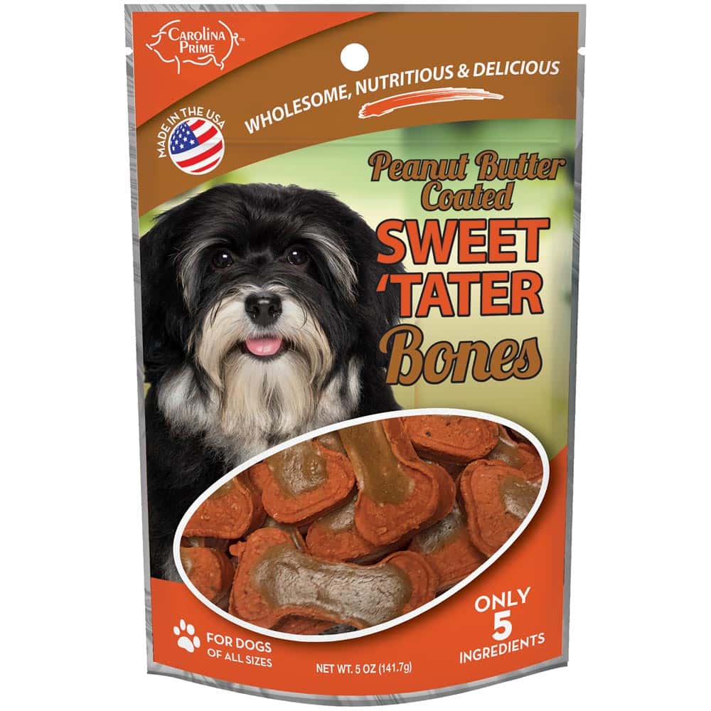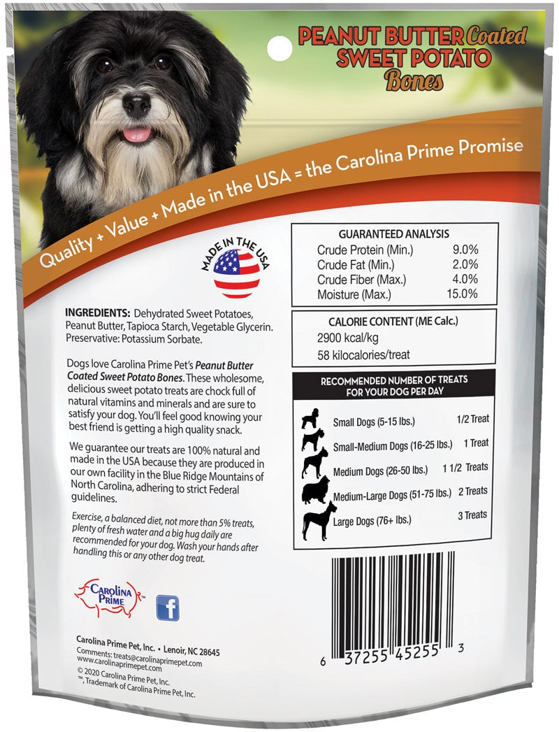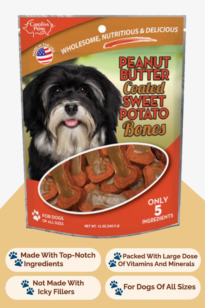 Carolina Prime Sweet ‘Tater Peanut Butter Coated Bones are delicious, ready-to-eat treats. They feature exceptional ingredients, and flavors your dog will crave. We’ve dehydrated delicious sweet potatoes and smothered them with smooth, tasty peanut butter. Get ready for some never-before-seen dog excitement with these oh-so-yummy sweet potato bones.